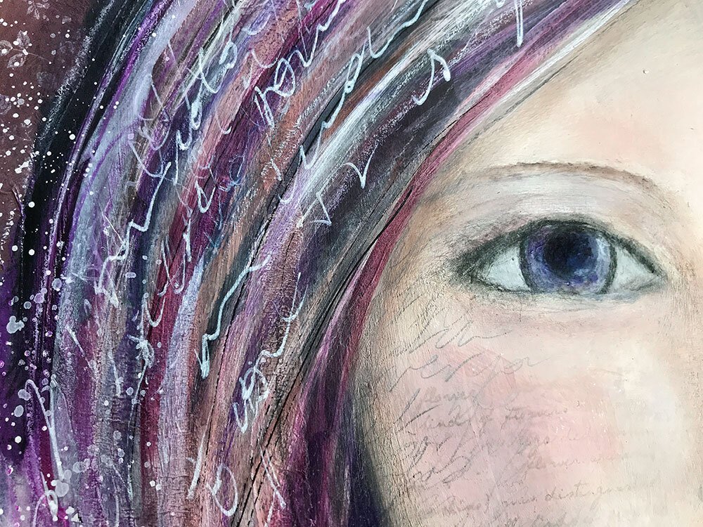 I liked the background and didnβt feel the need to add to it too much, but I played with my brush to create some βcrystalsβ in the foreground. Then I journaled some more on the page, her face, her hairβ¦ and in the end she told me her name: Spirit of Amethyst.