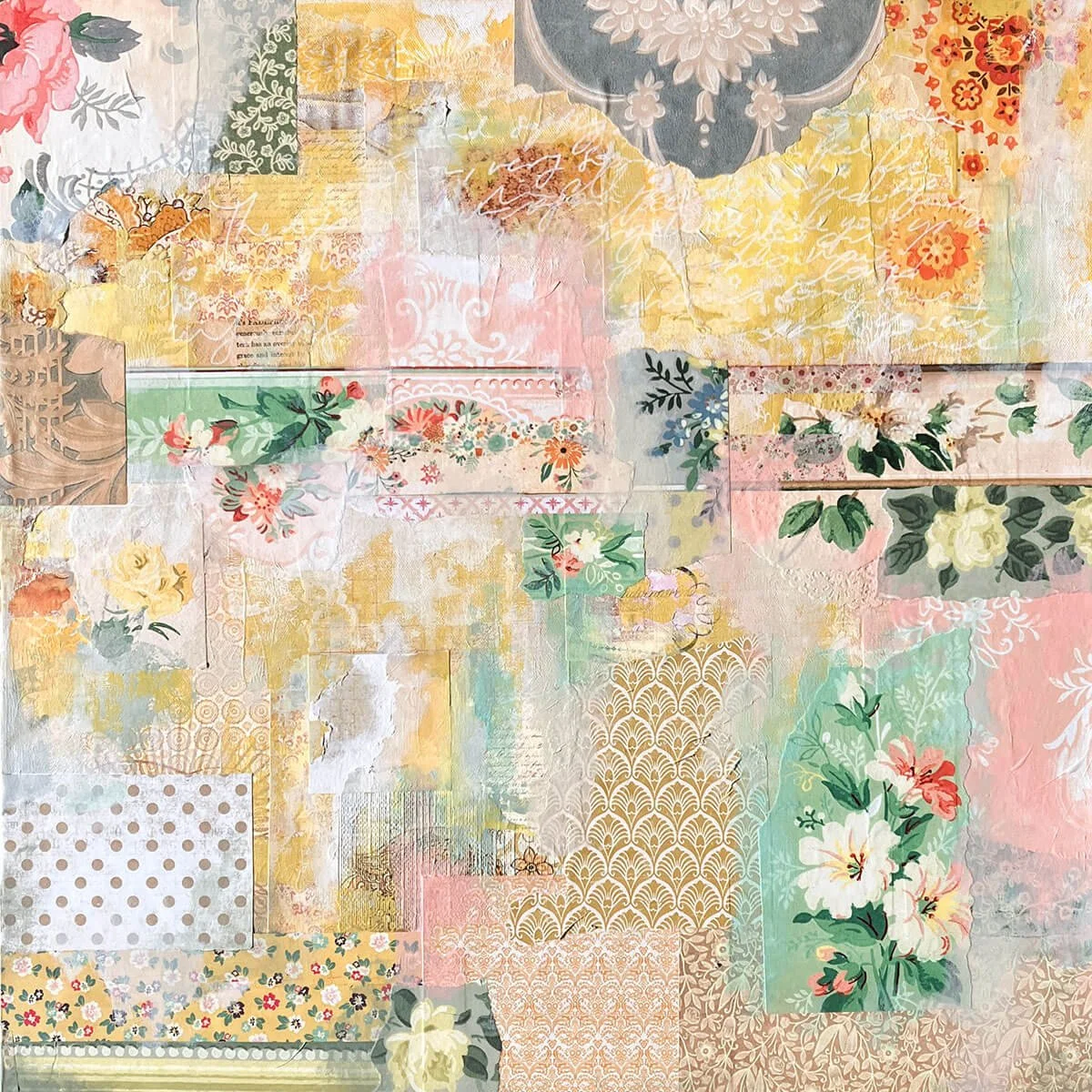 I started covering up the yellow with more collage, paint, and journaling, staying true to my floral inspiration. I created a "ribbon" of collage across, thinking it would turn into one of my beloved butterfly paintings... and that's when I got stuck all over again!