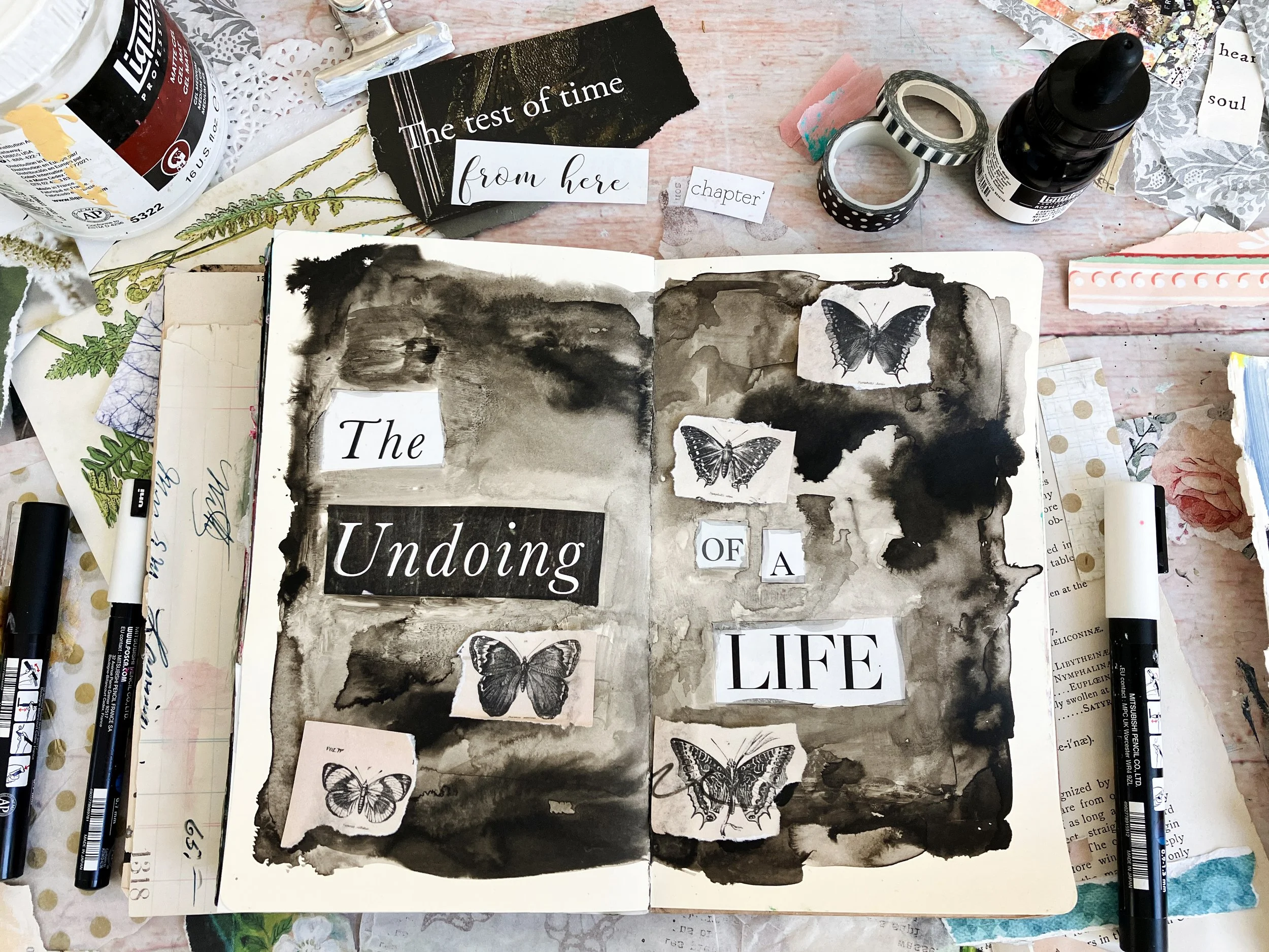 Then butterflies, as always, landed on the page, all from a little piece of paper that had been lying on my table for a while. They needed to take flight, like so many memories and feelings in desperate need to be released.