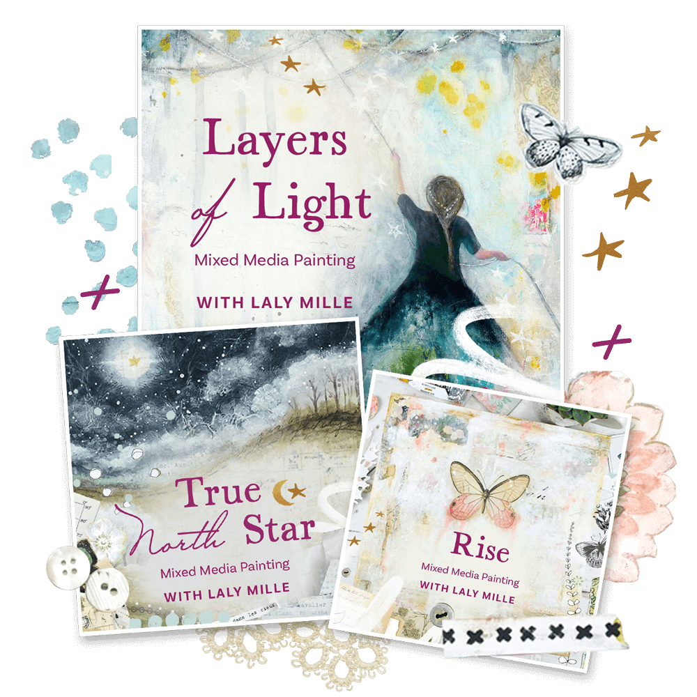 “Layers of Light” is a beautiful, soulful class where you’ll get to express the light of your soul in a whole variety of mixed media painting projects.