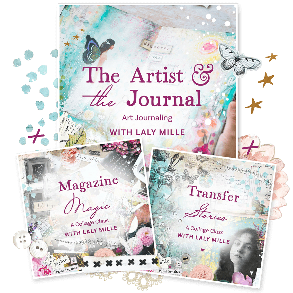 This bundle offer includes my two brand new art journaling classes, Magazine Magic and Transfer Stories, plus my foundational, beginner-friendly art journaling class, The Artist & the Journal. These three magical art journaling journeys perfectly complement each other, to help you create beautiful and meaningful layered art.