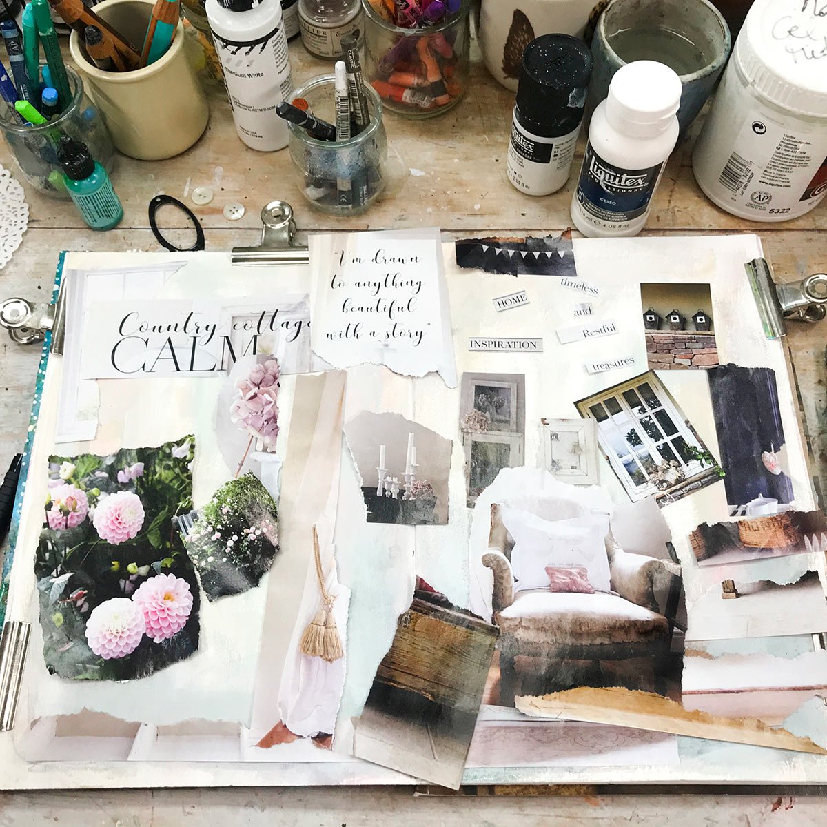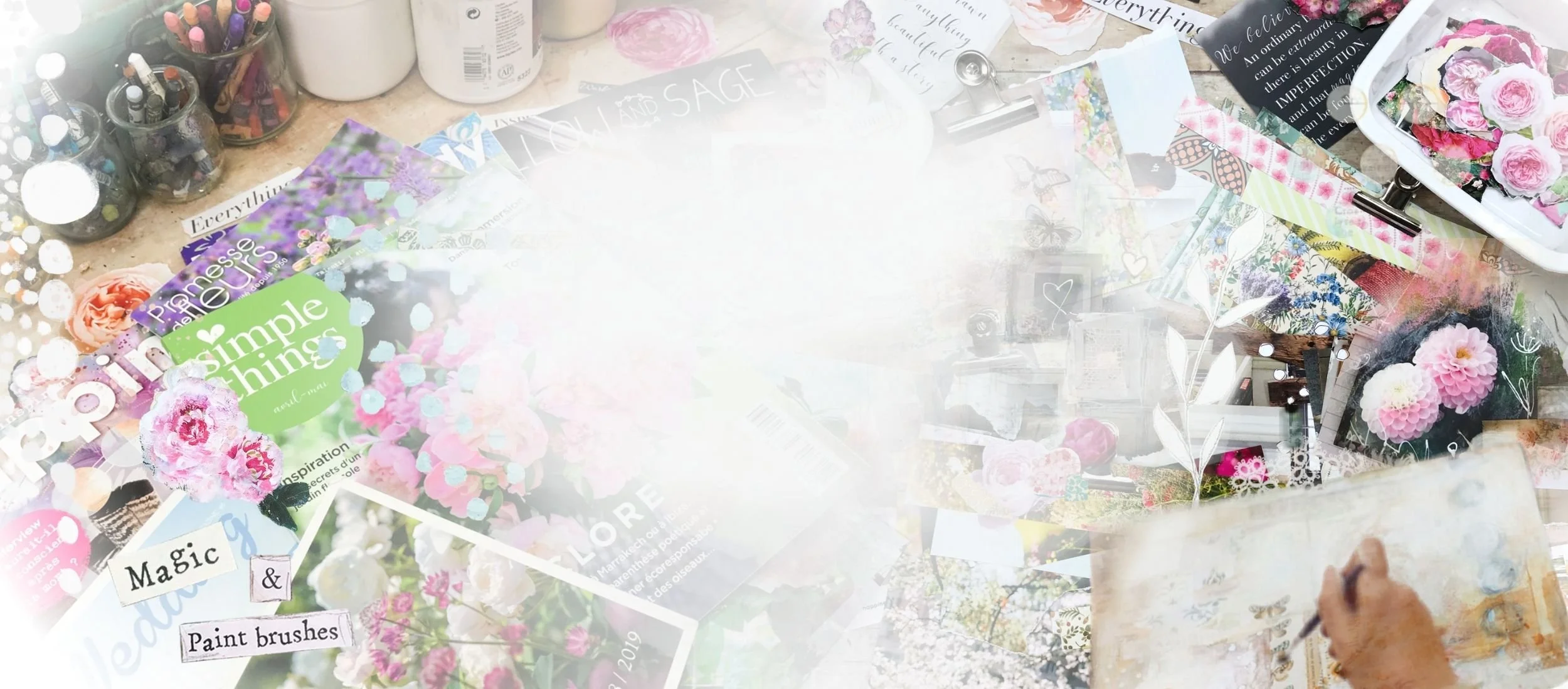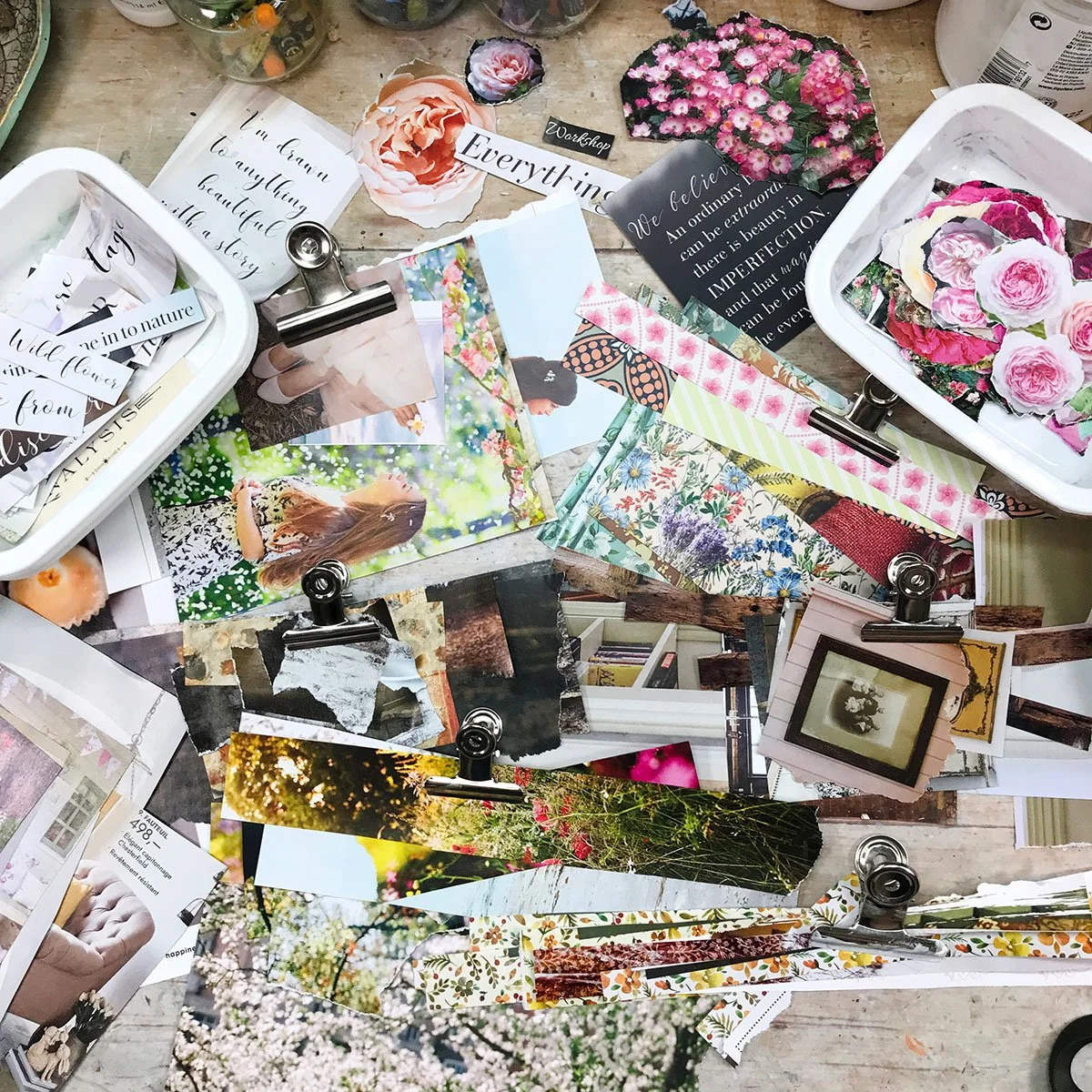 For this second page, we begin by gathering floral inspiration from magazines—flowers, branches, cottages, windows, and meaningful details that draw your eye. You’ll learn how to sort your images into intuitive groups, guided by color, atmosphere, and what resonates with you.