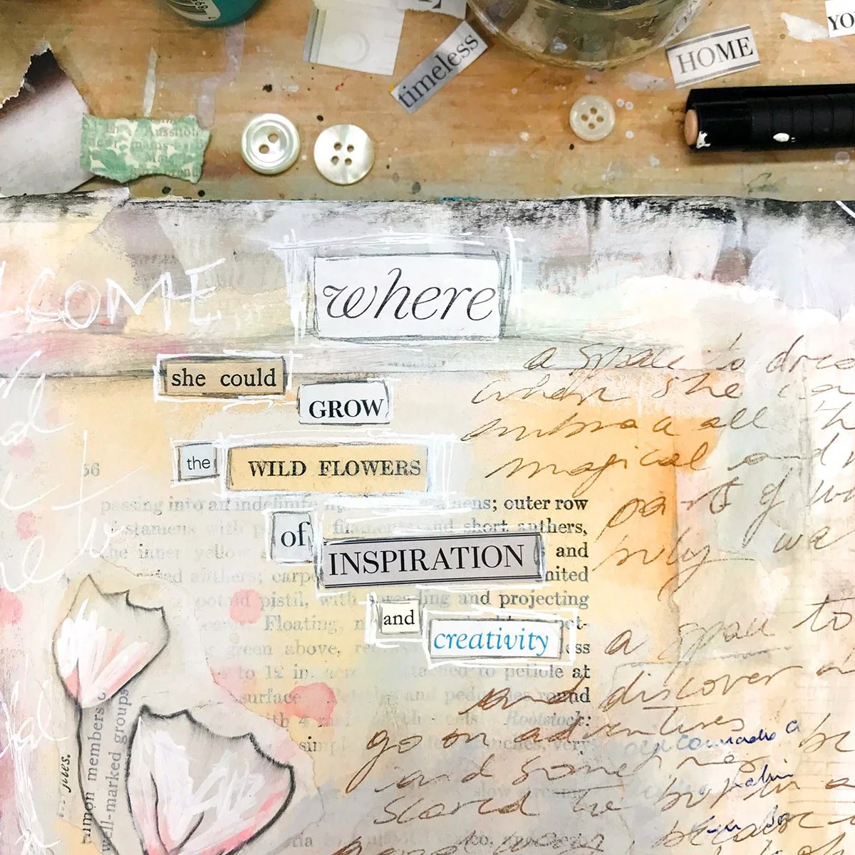 That’s where layering, blending and combining images with different supplies makes all the difference. As you combine images, text, and textures that resonate with you, trusting your intuition and imagination, your page will naturally begin to form a story—one that reflects your inner world and grows organically as you create.
